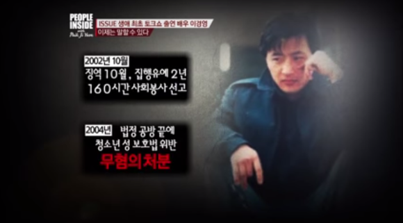 이경영: "그 당시(2002년) 항소를 해서 무죄판결을 받았다면 제가 지금 이렇게 힘들지 않을 거예요. 핑계처럼 들릴지 모르지만 하늘에 맹세코 출연을 미끼로 그 아이를 성적 유희의 대상으로 삼은 것은 아니었어요. 돈을 주고 성을 산 적도 없고요. 전 지금도 제가 욕망을 느꼈던 사람이 나중에 알고 보니까 미성년자였다는 게 부끄러울 뿐이지 다른 부분은 떳떳해요."