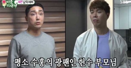 <스무 살까지는 친아버지가 키워줬지만 성인 이후에는 물심양면 박수홍의 도움을 받았다> 이에 박수홍은 <내 유산을 물려받겠다는 이야기 같다. 얼마 전에 자식이 없다면 자기가 자식이 되겠다더라>라고 너스레를 떨기도 했지요.