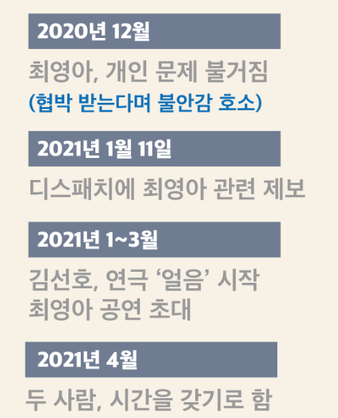 2021년 1월 11일, ‘디스패치’는 익명으로 제보메일을 받았습니다. 최영아 씨와 전남편, 둘의 이혼 사유, 그리고 김선호 이야기가 들어 있었습니다.