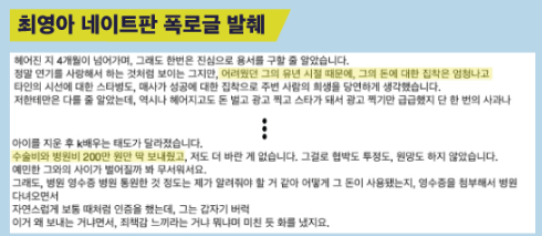 최영아는 김선호가 “가난한 유년 시절 때문에 돈에 대한 집착이 엄청나다. 수술비와 병원비 200만 원만 딱 보내줬다” 라고 김선호에게 ‘돈’ 프레임을 씌웠습니다. 위약금 때문에 낙태를 강요한 사람, 아이를 지운 뒤에 200만 원만 던져준 사람으로 만들었습니다.