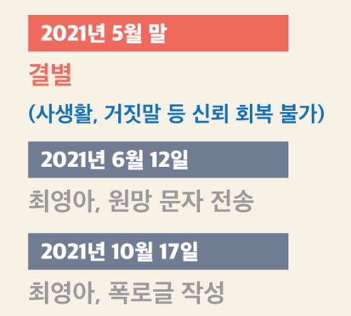 최영아는 “전남편과 관계된 사람들이 나를 협박한다”고 말하고 다녔는데 김선호의 지인 E씨가 최영아의 당시 사건을 알고 있었습니다. 1월부터 4월까지의 일들을 기억하고 있더군요. 일반인이 느꼈을 때 ‘충격’적인 상황이었으니까요.