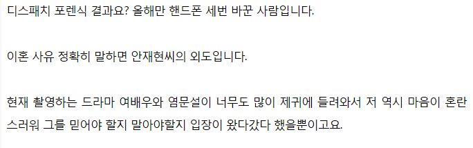 구혜선은 다시 자신의 인스타그램으로 자신의 정확한 이혼사유는 안재현의 외도였다며 안재현의 외도를 폭로했다.