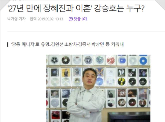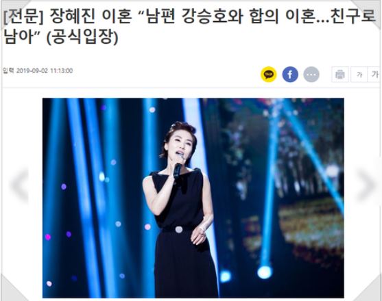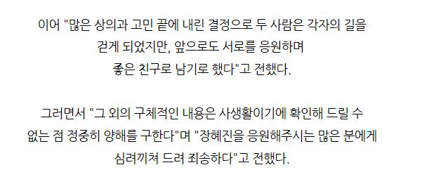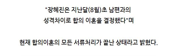 장혜진과 강승호 대표는 성격차이로 인해 이혼을 결정하였지만 이혼 후에도 서로의 길을 응원하기로 했다"고 전했다.