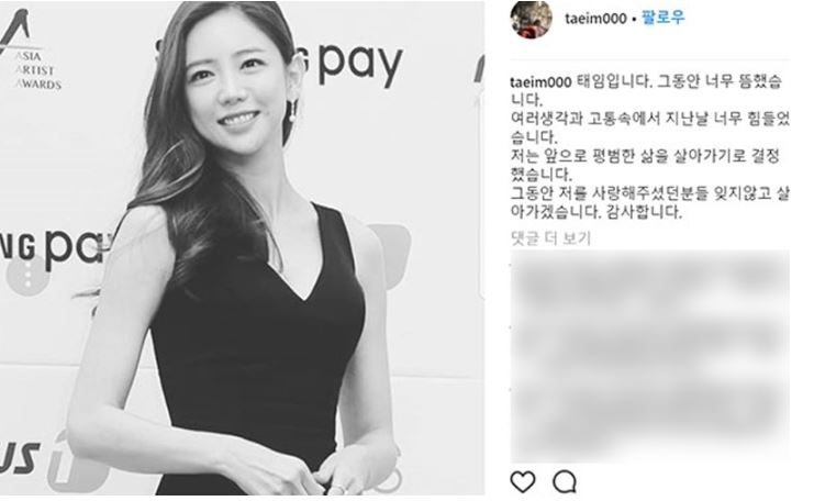 지난해 결혼 후 은퇴를 선언한 이태임은 지난해 3월경 남편의 구속을 전후해 심리적 부담을 느꼈으며 이에 은퇴를 선언한 것이라고 해요.