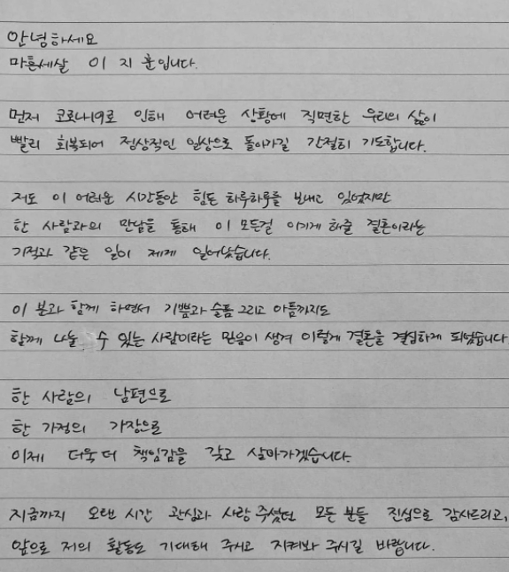 이지훈 소속사 주피터엔터테인먼트는 "코로나 팬데믹 상황에 일본을 오갈수도 없었고, 서로의 대한 확신과 굳은 믿음으로 얼마전 혼인 신고를 먼저 했다"고 설명했다.