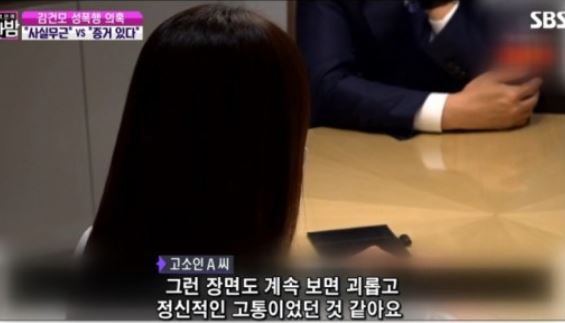 피해여성은 김건모가 자신을 성폭행할때 입었던 배트맨 티셔츠를 입고 방송에 나오는걸 보는게 괴로웠다고 한다