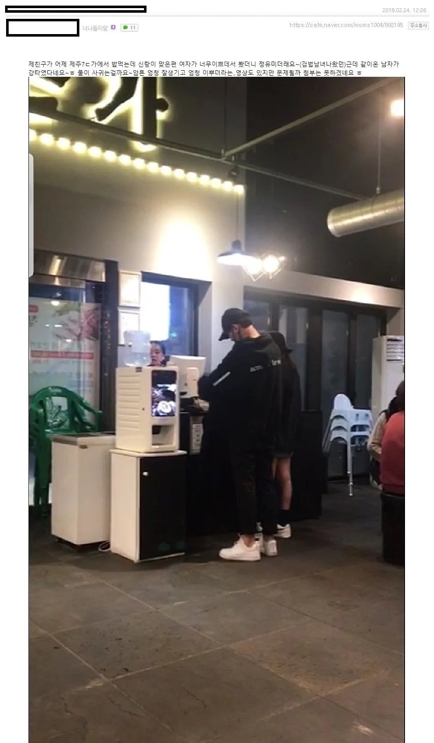 👉2019년 2월1일에 제주맘까페 제보가 있었는데요. 제주도에서 강타, 정유미 목격담이 떴씁니다. 2월에 정유미와도 사귀고 있었을 가능성이 컸다는 얘기겠죠? 왜 하필 단 둘이... 제주 식당에 있을까요..? 추론상 강타는 오정연, 정유미를 만나고 있는 상황입니다.