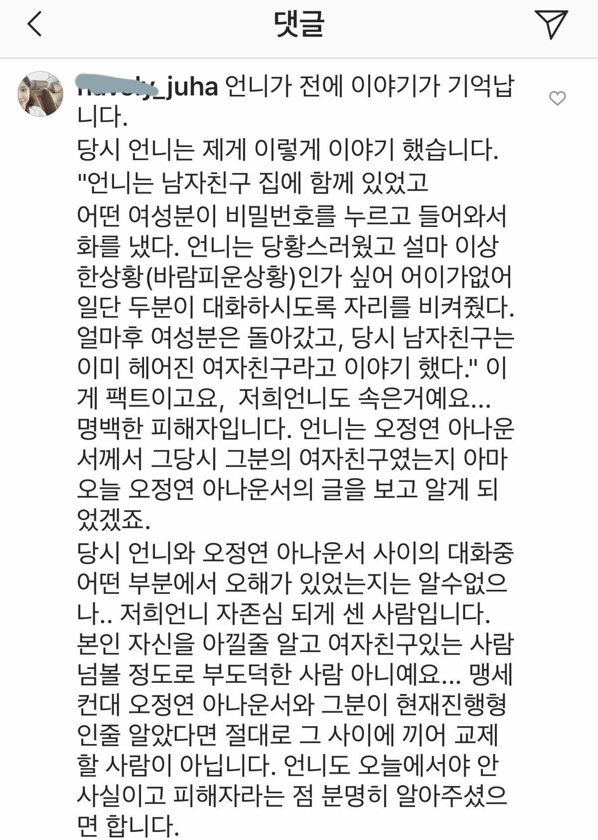 동생의 댓글 대략 요약하자면. 언니가 했던말이긴한데. 자리 비켜줌. 언니는 오정연과 강타가 사귀는걸 알았다면 절대 안건드릴성격이라고 함. 자존심이 세서... 누리꾼들에게 그만 욕해달라고 부탁....