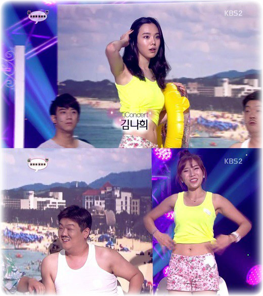 김나희는 8월 11일 방영된 `개그콘서트` `점점점` 코너에서 민소매 배꼽티에 꽃무늬 핫팬츠를 입고 볼륨감 넘치는 몸매를 자랑해 단번에 시청자들의 눈길을 끌었다.