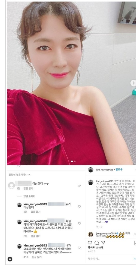 김미려는 30일 자신의 인스타그램에 "그만 좀 하십시다. 이건 그나마 유해서 제가 공개합니다. 과거에 악플 남기셨던 분들 다행인 줄 아세요. 캡처는 다 해놨지만요"라는 글을 게재했다.