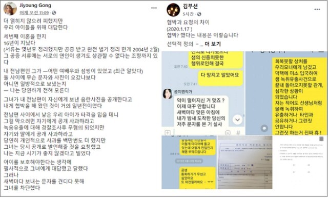 이에 공씨는 11일 올린 페이스북 글을 통해 "(녹음 유출에 대해) 공개적으로 사과한다"며 "(당시) 녹음을 유출시킨 이모씨의 전화번호를 경찰에게 주며 신고했지만 소식이 없다"고 했다. 또 "(김씨가) 자기와 딸에게 공개 사과하라고 해서 당연히 개인적으로 사과를 백만 번도 더 했지만 그녀는 당시 공개로 발언해줄 것을 요청했고, (당시) 나는 지금 시기가 좋지 않다고 빌었다"고 했다.