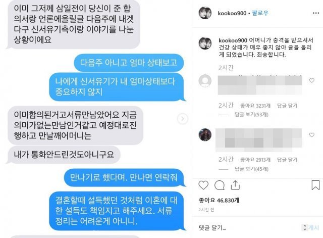 그리고 엄마의 상태가 안좋으니 엄마를 만나 둘의 이혼에 대해 설득해달라, 그렇지 않고 몰인정하게 굴면 가만 있지 않겠다 이런 내용인데요, 글은 약 5시간 정도 있다가 삭제가 되었으며 삭제를 한 이유는 알 수가 없는 상황입니다.