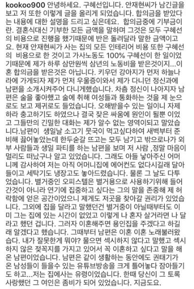 그러나 가정을 지키고싶다는 말과는 상이하게 안재현을 폭로하는 글들을 올리며 폭로전으로 가고 있는게 아닌가라는 의문을 사기도 했었다.