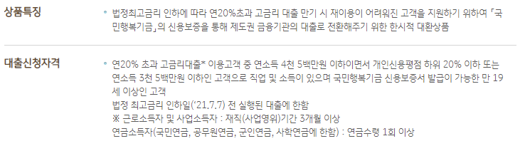법정최고금리 변경으로 정부가 한시적으로 지원하는 대환대출 상품이니 아래의 신청자격에 부합한다면 서둘러서 신청하시길 바랍니다.