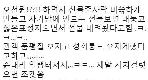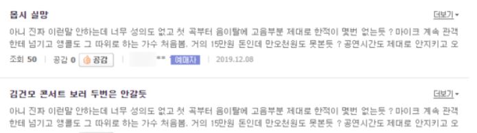 성폭행 의혹으로 논란의 중심에 있는 김건모는 콘서트를 강행했고 예정된 다른 콘서트들도 변경없이 진행하겠다고 했는데 김건모 콘서트를 관람했단 관강객들의 후기들을 보면 이번 김건모의 콘서트는 프로답지 못했다고 지적하고 있다.