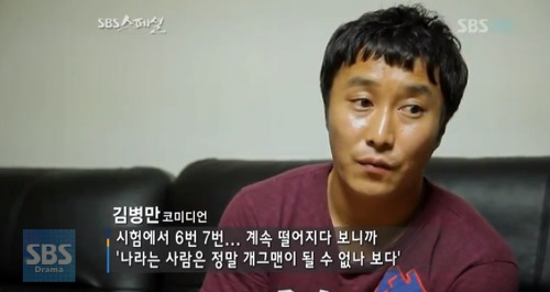 이런 어린 시절과 가난했던 가정환경 때문에 김병만은 화려한 입담과 재주보다는 자신의 희생을 바탕으로 한 성실한 개그성을 갖게 된 것이 아닌가 생각됩니다.