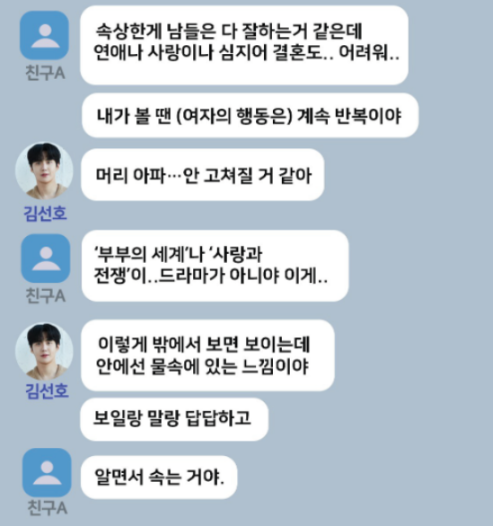 김선호는 이 문제를 친구와 상담했습니다. 아니, 하소연이죠. 아래, 해당 카톡 대화입니다.