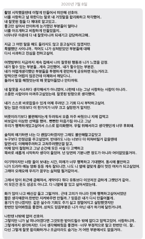 최영아씨는 2020년 7월 8일 김선호에게 장문의 사과 문자를 보냈습니다.