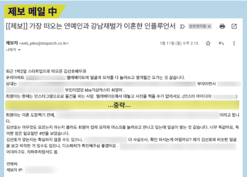 2021년 1월 11일, ‘디스패치’는 익명으로 제보메일을 받았습니다. 최영아 씨와 전남편, 둘의 이혼 사유, 그리고 김선호 이야기가 들어 있었습니다.