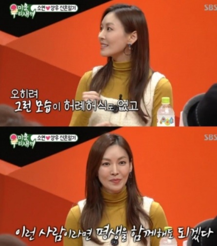 "이상우가 드라마를 찍는 8개월 내내 같은 옷을 입었다. 연애할 때도 그랬다. 허례허식도 없고 본인에 대해 자신감 있어 보였다. 이런 사람이라면 평생 함께 해도 되겠다 했다"고 털어놨습니다.