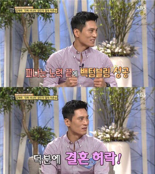 이어 김재우는 "장인어른의 질문에 백텀블링 못 한다고 답했더니 그럼 배워서 오라고 하셨다"며 "피나는 노력 끝에 제대로는 못하지만 백 텀블링을 성공해 아내와의 결혼을 허락받았다"고 말했습니다.