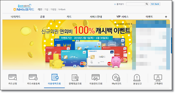 두번째 방법은 농협카드사 홈페이지를 이용하는 방법입니다. 이 방법은 공인인증서가 PC에 설치해야 이용내역 조회와 프린터를 할 수 있습니다. PC에 공인인증서가 없는 분들은 유선상담이 훨씬 빠르겠죠? 농협 카드사 홈페이지에서 이용내역조회를 눌러주세요.