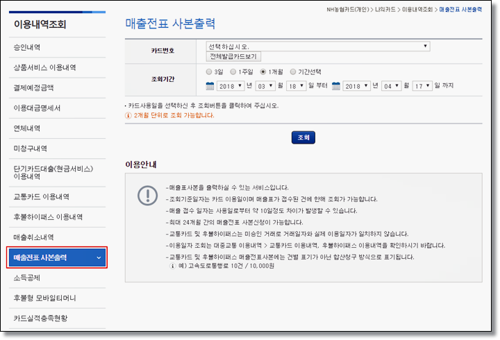 그런 다음 서비스 메뉴에 보이는 [매출전표 사본출력]을 눌러 카드를 선택하고 조회기간을 설정해 확인 후 프린터하시면 됩니다. 2개월 단위로 조회가 가능하며 최대 24개월 간의 매출전표 사본신청이 가능합니다.