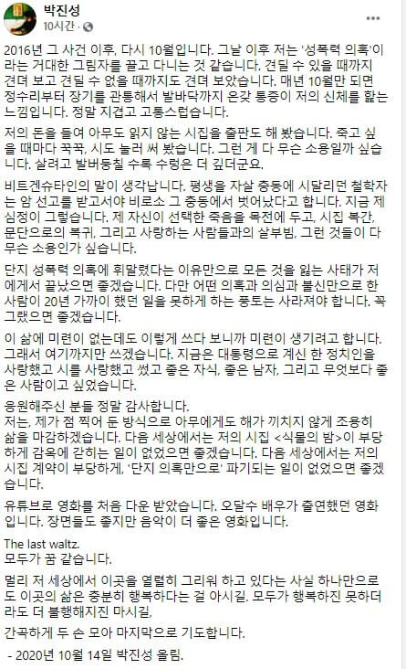 박진성 시인이 페이스북에 올린 글을 보면 해마다 10월이 되면 과거의 끔찍했던 경험으로 인해 무척이나 힘든 시간을 보내는 것을 짐작할 수 있는데요. 가짜 미투로 인한 피해자라는 것이 입증됐지만, 그것과 상관없이 미투의 대상으로 지목됐었다는 것 하나 만으로 온갖 비난을 다 받아야 했기 때문에 정서적으로 꽤나 어려운 시간을 보냈었나 봅니다.
