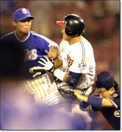 이미 자신을 겨냥할 것이라는 예측을 하고 있었던 조인성은 공에 얻어맞자마자 제지하는 허운 주심을 뿌리치고 득달같이 마운드로 짓쳐 달려가 배영수에게 발차기를 했습니다. 배영수도 발을 같이 내밀었던 상황이었는데요.