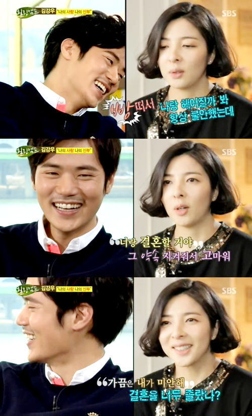 김강우 : "심지어 친구가 내게 소개시켜주려던 여자였고 자연스럽게 합석을 해 술을 마시게 됐다. 그 때 아내를 보는데 뒤에서 후광이 비쳤다. 나는 아내에게 반해 있었고 이후 술을 마시다 친구들이 뽀뽀하라고 등 떠미는 바람에 첫 만남에 아내와 첫 키스를 했다"