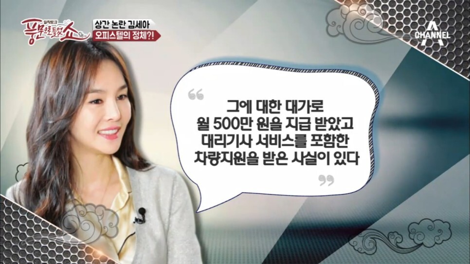 김세아는 "소송이 있었다. 1년 반, 2년을 가면서 너무 힘든 시간을 보냈다. 어떤 분들이 이혼을 하면서 그 이혼을 저 때문에 한다고 그 소식을 뉴스에 냈다. 결혼 7년 후 있었던 일이다. 당시 그 쪽에서 인도네시아 가방 사업을 한다고 하면서 사업적 제안을 받은 상황이었다. 그 때 당시 회사에서 크리에이티브 디렉터로 활동을 하고 있었다. 딱 두 달 일을 하고, 월급을 두 번 받은 후 스캔들이 터졌다. 제가 어느 회계법인의 카드를 썼다는데, 이 자리에서 얘기하지만 저는 그 카드를 받아본 적도 없다. 그 때는 진짜 뒤통수를 세게 맞은 느낌이었다"고 말했다.