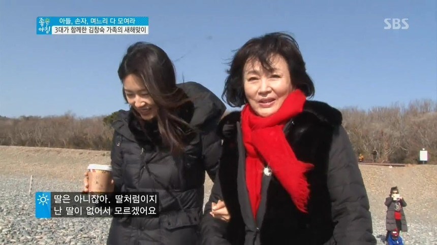 고부사이라고는 믿기지 않을 만큼 다정한 두 사람의 모습에 제작진은 "정말 모녀 같다"고 말을 꺼냈고, 이에 김창숙은 "며느리지 딸은 아니다. 딸처럼이지. 난 딸이 없어서 모르겠다"고 시원스레 현대 시어머니상의 면모를 드러냈습니다.