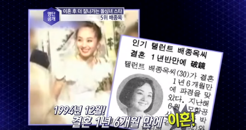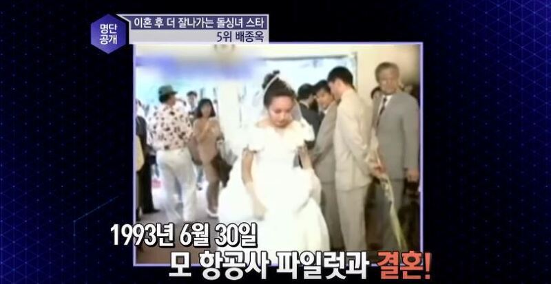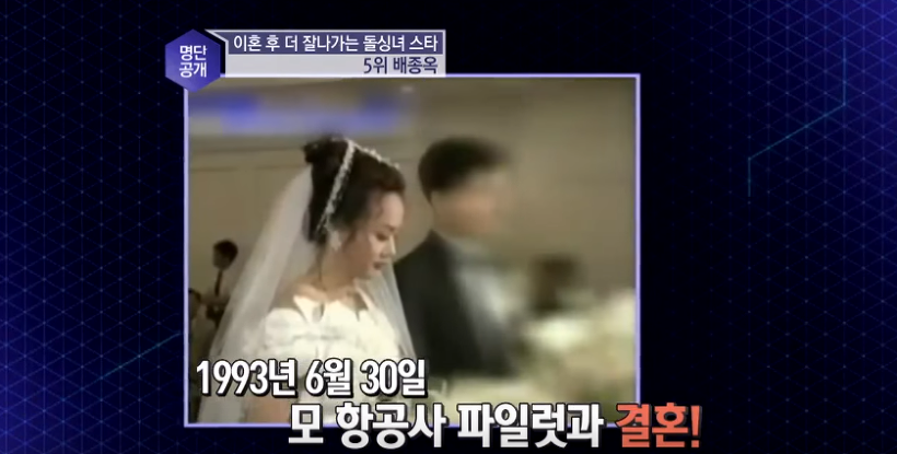 배종옥은 지난 1993년 모 항공사 항공기 조종사와 서울 청담동에서 결혼식을 올렸는데요, 이후 결혼한지 얼마 지나지 않아 1994년 12월 남편과 합의 이혼을 하게 됩니다. 당시 남편은 2살 연상이었다고 하는데요,