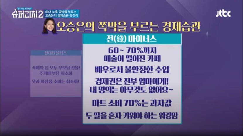 오승은씨는 과자에 대한 집착이 심한데, 마트에 두번 가면 과자값만 8,9만원이 나오고 한달에 70만원 과자값을 쓴다고 치면 10년이면 8500만원 정도 금액이 나온다고 합니다.