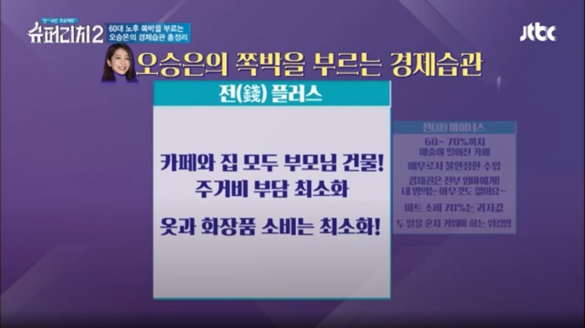 오승은씨는 과자에 대한 집착이 심한데, 마트에 두번 가면 과자값만 8,9만원이 나오고 한달에 70만원 과자값을 쓴다고 치면 10년이면 8500만원 정도 금액이 나온다고 합니다.