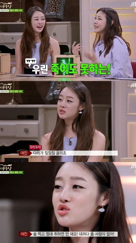 최여진: "하지만 남자에게 업혀본 적은 없다. 다리가 질질질 끌린다. 그리고 술 먹고 절대 취하면 안 된다. 데려다줄 사람이 없다."