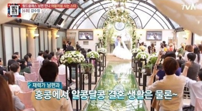 강수정은 결혼 당시 홍콩 6성급 호텔에서 비밀 결혼식을 올리며 수천만 원을 호가하는 명품 웨딩드레스에 591개의 다이아몬드가 세팅된 8000만 원 상당의 목걸이를 착용하는 등 초호화 결혼식을 올리며 큰 화제를 모았습니다.