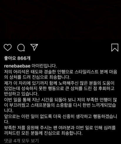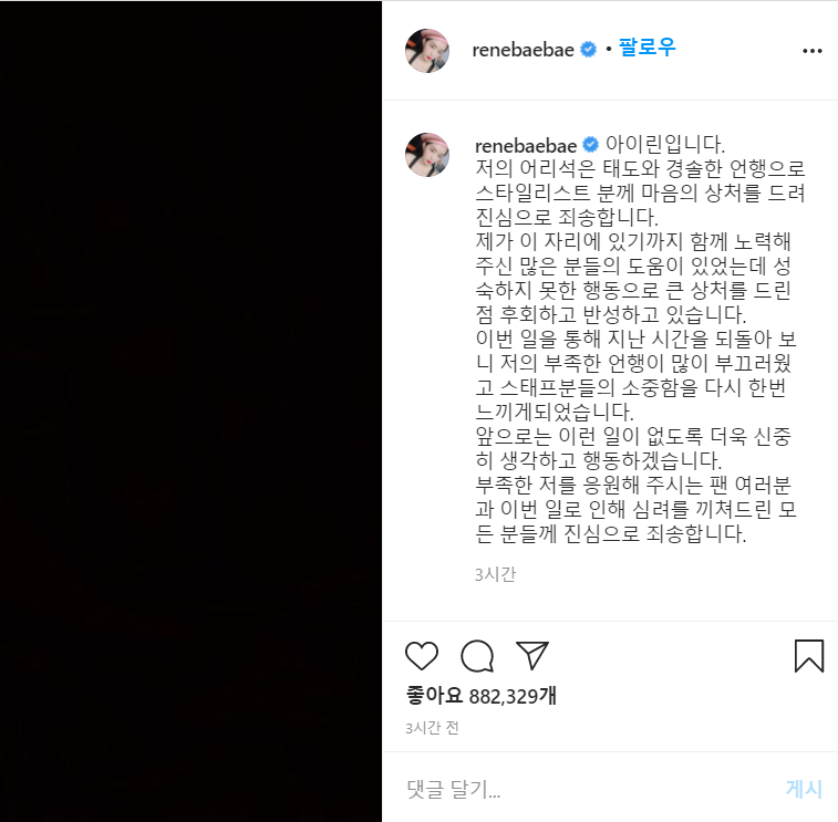 아이린은 10월 22일 자신의 인스타그램에 "저의 어리석은 태도와 경솔한 언행으로 스타일리스트 분께 마음의 상처를 드려 진심으로 죄송하다"며 사과문을 게재했습니다.