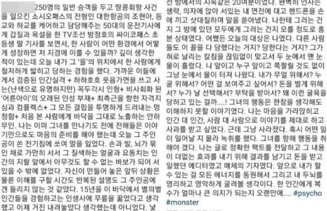 2020년 10월 20일 스타일리스트 A씨는 자신의 SNS에 한 여성 연예인에게 폭언을 당했다는 내용의 글을 게재해 파장을 일으켰습니다. 이 글에 따르면, A씨는 한 연예인으로부터 15년을 업계에서 일한 A씨가 20분만에 울 정도의 폭언과 갑질을 당했다고 합니다. A씨는 그녀의 말을 녹취했으며 그녀는 사과도 없이 그냥 나가버렸다는 이야기입니다.