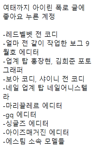 그 외에 레드벨벳 전 코디인 김예진, 업계 최고 디렉터 홍장현 및 김희준 포토그래퍼, 보아 코디 및 샤이니 전 코디, 에스팀 소속 모델들 YG K PLUS 모델들, 모델 출신 패션에디터 박희우, GQ 에디터, 싱글즈 에디터, 아이즈 매거진 에디터 및 타 소속 모델들까지 전부 해당 글에 좋아요를 눌렀습니다. 그만큼 이미 패션계 및 방송계에서 유명했다는 사실이라고 보여지고 있습니다.