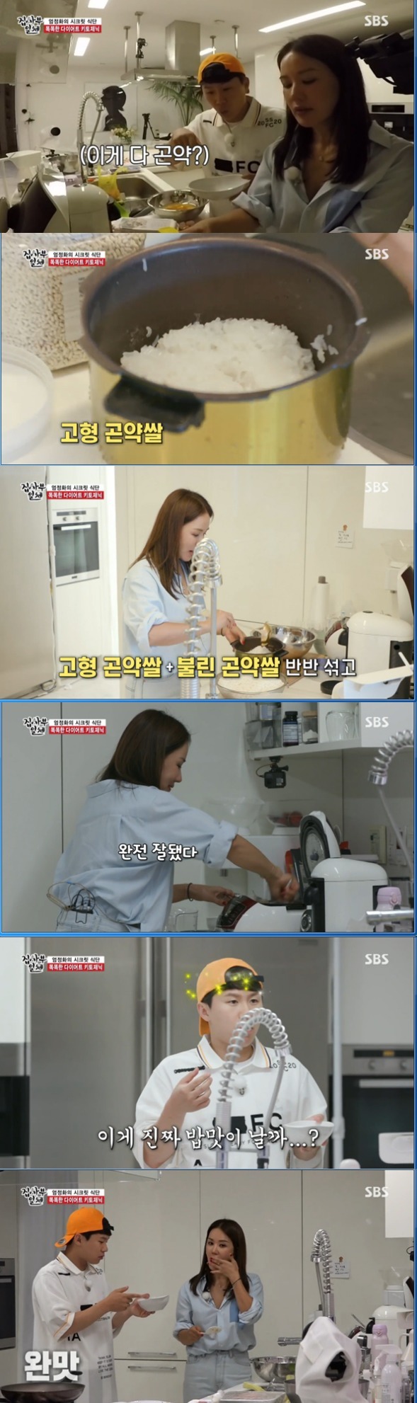 집사부일체 멤버들은 빵가루 없이 돈가스가 가능하냐고 반신반의했지만, 이를 맛보고 "너무 맛있어서 미치겠다"는 반응을 보였는데요, 엄정화는 쌀 대신 곤약밥과 곤약떡으로 김밥과 떡국을 만들고, 밀가루를 사용하지 않은 돈까스를 멤버들을 위해 대접했습니다.