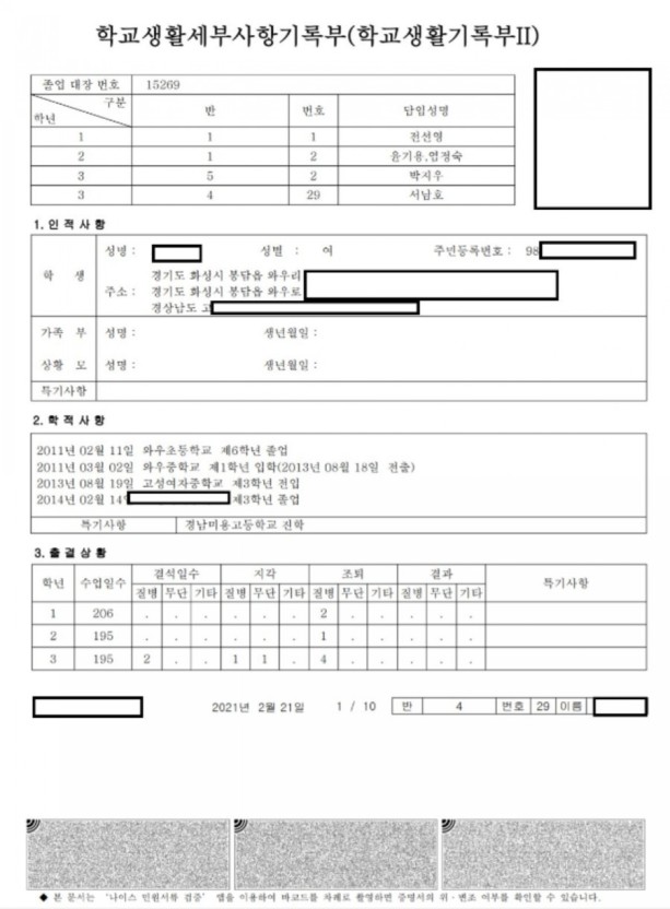 A씨는 이와 함께 학교생활 기록부를 공개했다.