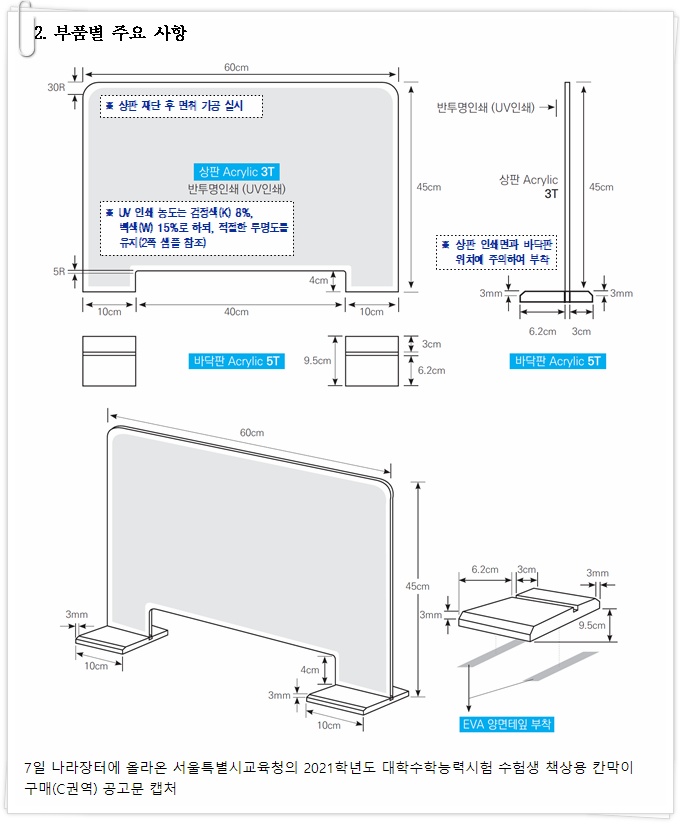 청원인은 “수험생들의 당일 책상 크기가 시험지 크기에 비해 작은 편임에도 가림막을 세우게 되면 책상 공간이 더욱 협소해 불편이 따른다”며 “시험 당일날 익숙하지 않은 구조물의 등장으로 시험에 방해요인으로 작용할 수 있다”고 강조했다.