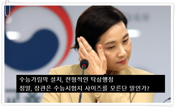 수능 가림막 논란이 거세지고 있다. 급기야 수능 가림막 논란은 청와대 국민청원에 등재되면서 유은혜 장관의 수능 가림막 설치계획이 전형적인 탁상공론으로 끝날 조짐이다.
