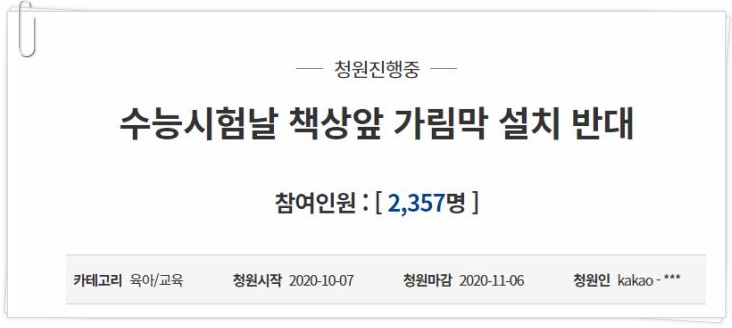 7일에는 청와대 국민청원에 ‘수능시험날 책상앞 가림막 설치 반대’라는 제목의 청원도 올라왔다.