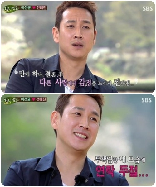 이선균은 솔직히 결혼후 아내 말고 누군가를 좋아하게 된다면 법적으로 죄가 된다는 게 겁이 나고 고민이 계속되었다며 우울하고 다운돼 술을 먹는 등 비겁한 모습을 보여 아내를 떠나게 했다고 고백하기도 하였습니다.