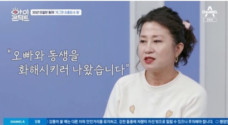 최홍림의 누나는 오빠가 두렵고 밉고 보고싶지 않아 심지어 결혼식에도 부르지 않고 없는 존재로 생각하고 살았는데 어느날 오빠에게 전화가 왔는데 풀 죽어 있는 모습이 짠해서 본인은 용서를 했다며 처음엔 망설였지만 이대로 있다간 남보다도 못한 관계가 될까봐 둘을 화해시키기 위해 나왔다고 '아이콘택트'에 출연한 이유를 밝혔습니다.