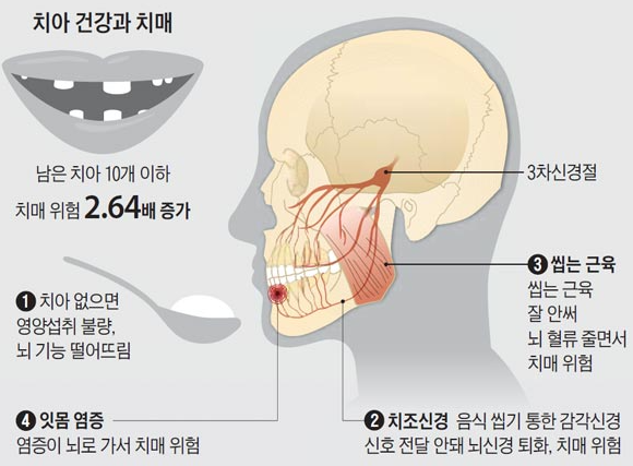 이빨 특히 어금니가 없어 음식을 씹기 어려운 상태로 장기간 생활하는 경우 치매 위험도가 증가한다는 연구자료가 있습니다.