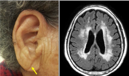 귓볼에 주름이 생기는 원인은 귀의 각 부위 특히 귓볼부위의 미세혈관까지 혈액순환이 원활하지 않음을 보여준다고 합니다. 이와 연관하여 뇌의 작은 혈관들에 혈액순환이 원활하지 않아 막히게 되며 위의 우측 MRI사진의 뇌 중앙부가 하얗게 변성되는 경우가 있다고 합니다.