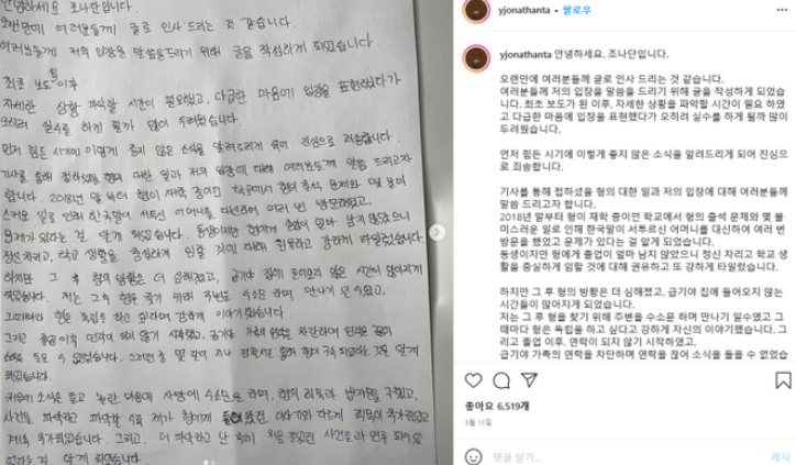 관련해서 장문의 사과 자필 편지를 올렸으나